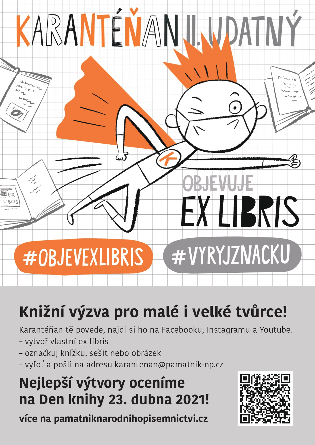 Karantéňan v novém videu vyhlašuje také další výzvu k samostatné tvorbě. Až do 23. března 2021 přijímá ukázky vlastnoručně vytvořených ex libris – knižních značek ve formě razítka. Vítězové budou odměněni u příležitosti Dne knihy, který připadá na 23. dubna. Výzva je otevřena pro jednotlivce, skupinky i školní kolektivy, které jsou v době nouzových opatření odkázány na online výuku a samostudium. Podrobné informace k soutěži zveřejňuje Karantéňan na svých sociálních sítích pod hashtagem #objevexlibris #vyryjznacku a na webu.