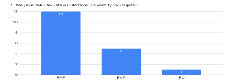 Prví část sekce zjišťuje, na jaké fakultě či ústavu respondenti vyučují. Jak je z grafu 1 patrné, tak největší podíl vzorku zastupují respondenti z Filozoficko-přírodovědné fakulty (FPF), jichž je dvanáct, následně Fakulty veřejných politik (FVP), jichž je pět a jeden zástupce z Fyzikálního ústavu (FÚ). Nezapojil se tedy žádný respondent z Matematického ústavu.