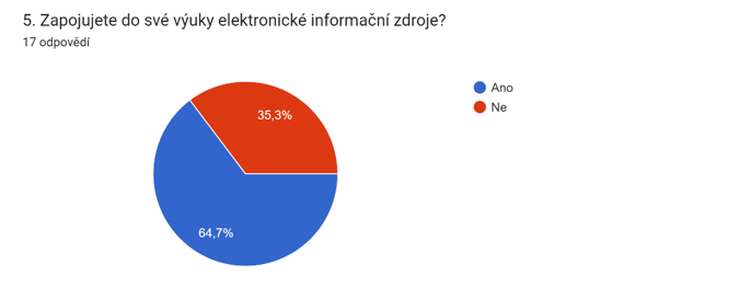 Pátá otázka se týká práce s EIZ. Respondentů jsme se zeptali, zda je zapojují do výuky. Na tuto otázku odpovědělo kladně 64,7 % respondentů a zbylých 35,3 % EIZ do výuky nezapojuje (viz graf 5).