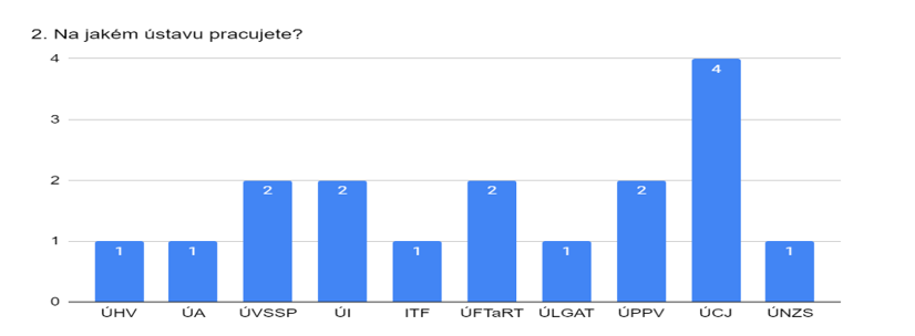Poslední otázka v sekci zjišťuje, na jakých konkrétních ústavech respondenti pracují (viz graf 2). Největší podíl z celkového vzorku zastupují respondenti z ústavu Ústav cizích jazyků (ÚCJ), konkrétně čtyři, poté následují ústavy z Ústav informatiky (ÚI), Ústav pedagogických a psychologických věd (ÚPPV), Ústav veřejné správy a sociální politiky (ÚVSSP) a Ústav filmové, televizní a rozhlasové tvorby (ÚFTaRT), ze kterých odpověděli vždy dva respondenti a po jednom zástupci také ústavy: Ústav hudební vědy (ÚHV), Ústav archeologie (ÚA), Institut tvůrčí fotografie (ITF), Ústav lázeňství, gastronomie a turismu (ÚLGAT ) a Ústav nelékařských zdravotnických studií (ÚNZS).